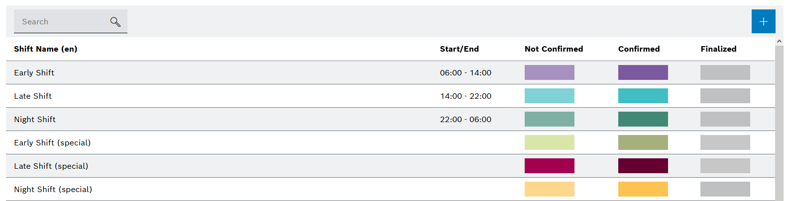 The status of a shift type is indicated by colors that can be assigned to the shift type: