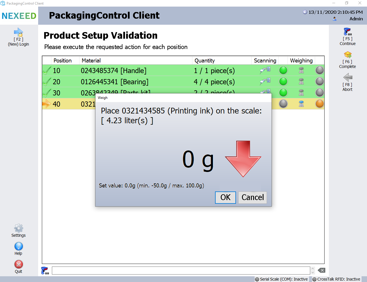 Saves the weight measured for the item. The button is only active if the measured weight is within the tolerance for the expected weight. A red arrow is displayed if the weight is outside (above or below) the tolerance. The button is actuated automatically if the measured weight remains within tolerance for three seconds. |