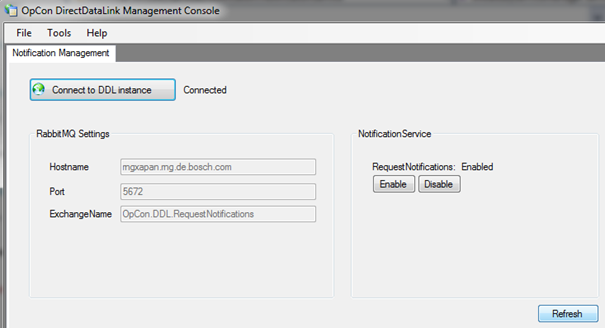 The service can be configured for the runtime with the help of theDirectDataLink Management Console (MMC). RequestNotifications may be started and stopped. In addition, all parameters of the configuration are visible.